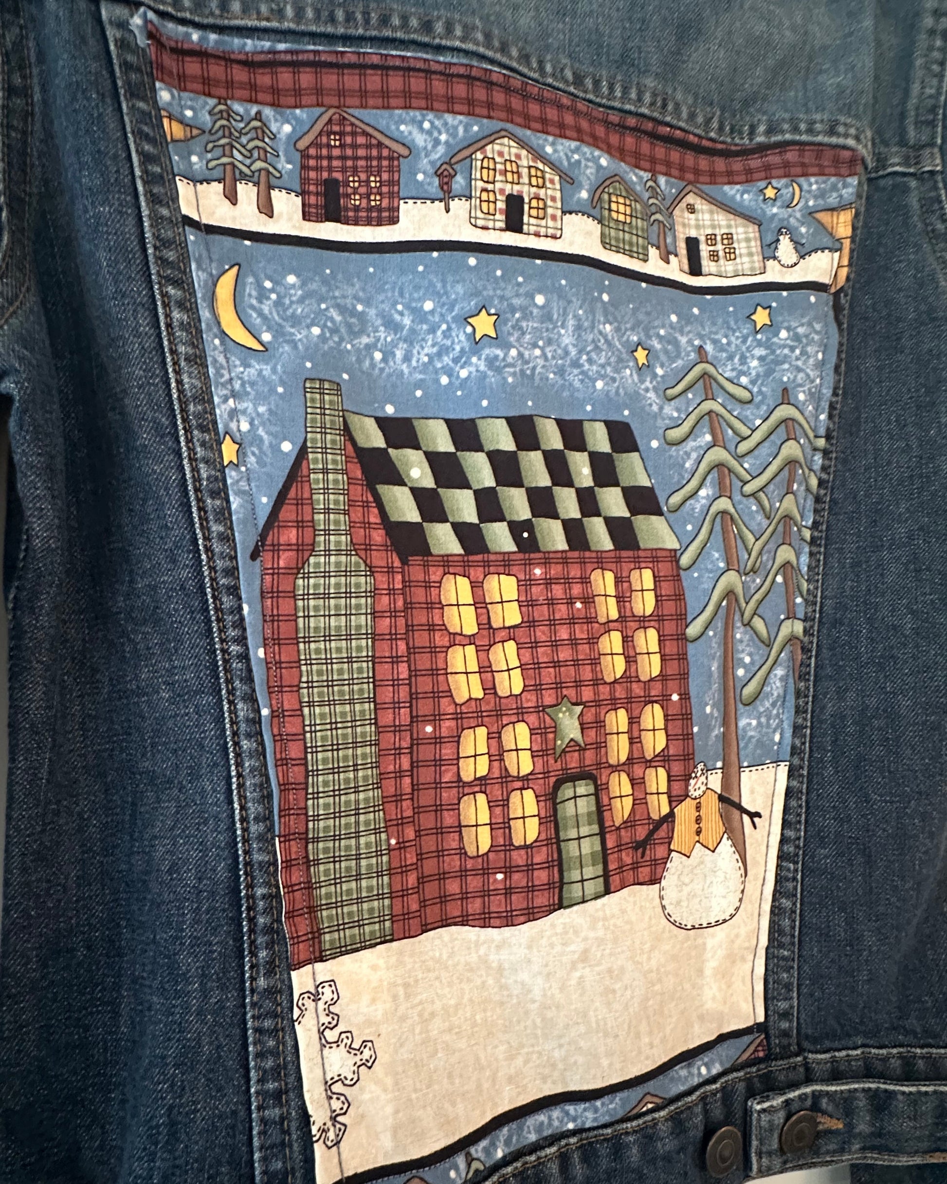 A little slice of kitch winter nostalgia! This thrifted denim jacket is one of two reworked by me using vintage deadstock cotton I found while living in Cyprus, featuring a 90's winter scene print. Cosy plaid cottages, a slightly creepy snowman, and lots of vintage charm for the Christmas obsessed denim jacket lover!